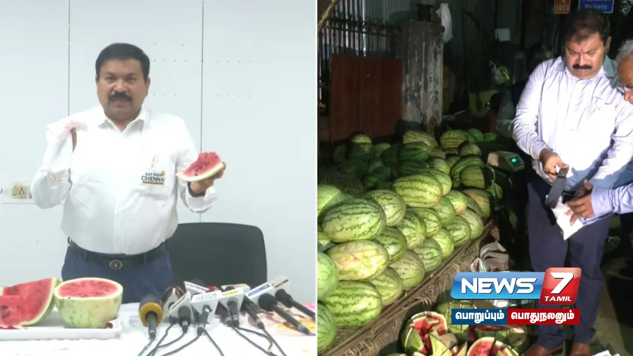 இதனைத் தொடர்ந்து சென்னை மாவட்ட உணவு பாதுகாப்புத் துறை நியமன அதிகாரி சதீஷ்குமார், விளக்கம் அளித்துள்ளார். அப்போது, “சென்னையில் இதுவரை மேற்கொள்ளப்பட்ட ஆய்வுகளில் ரசாயனம் கலந்த கலப்படமிக்க தர்பூசணி பழங்கள் (அடர்சிவப்பு பழங்கள்) கண்டுபிடிக்கப்படவில்லை. அதே நேரம், சோதனையின்போது பல கடைகளில் கெட்டுபோன, எலி கடித்த, அழுகிப்போன பழங்கள் ஏராளமாகக் கிடைத்தன.