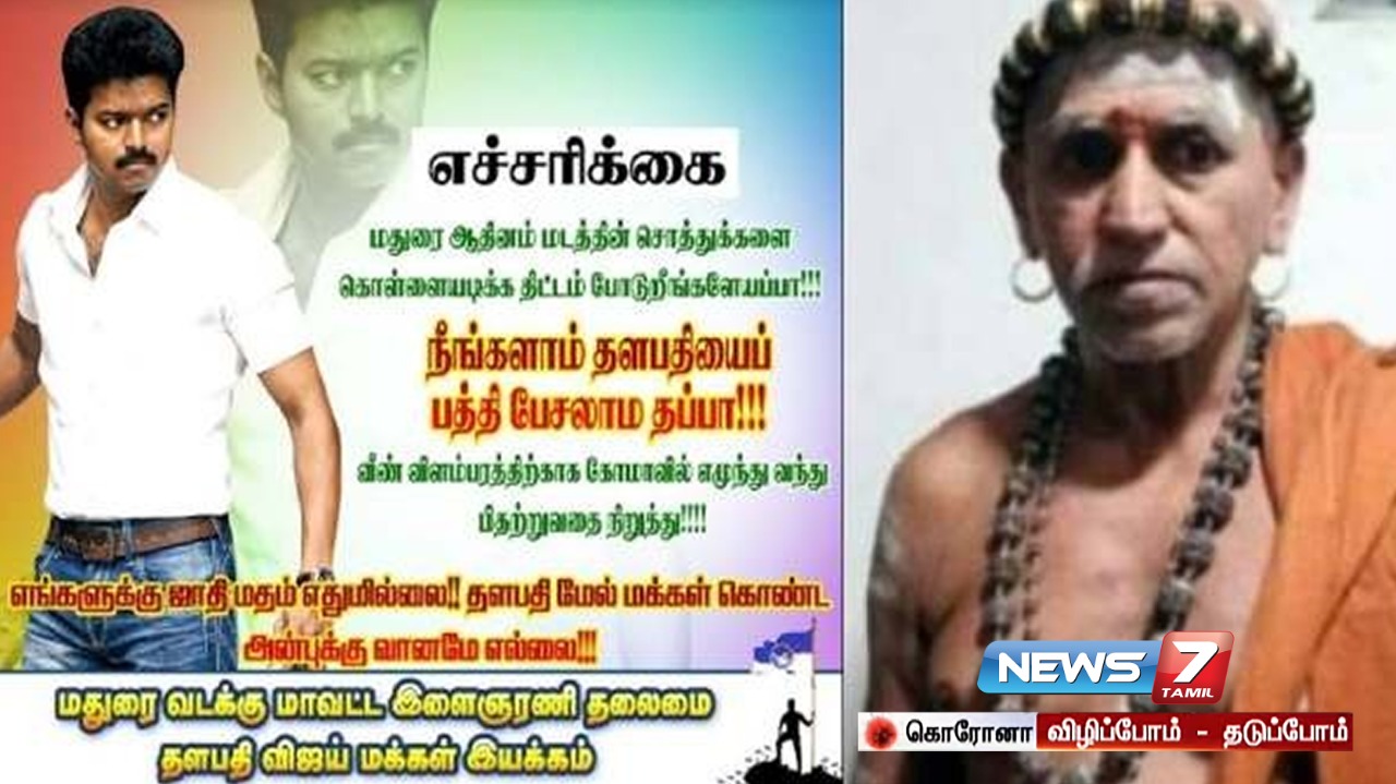 மதுரை ஆதீனம் ஏற்கனவே அரசியல் ரதீயாக பேசிய கருத்துகள் பேசுபொருளாகிய நிலையில் தற்போது விஜய் ரசிகர்கள் மற்றும் மதுரை ஆதீனம் இருவர்களிடையேயான போஸ்டர் யுத்தம் தொடங்கியுள்ளது.