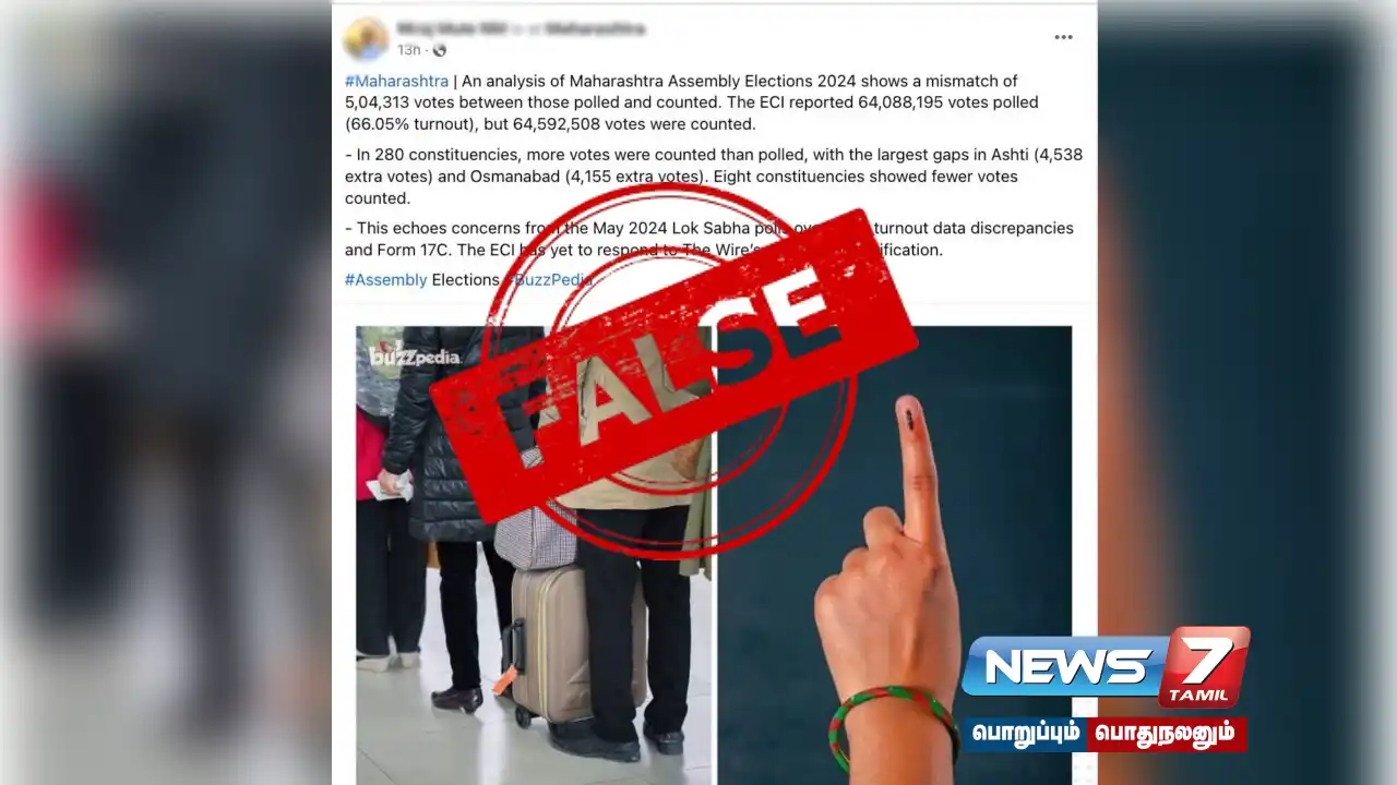 சமீபத்தில் நடந்து முடிந்த மகாராஷ்டிரா சட்டமன்றத் தேர்தலில் 5,04,313 கூடுதல் வாக்குகள் எண்ணப்பட்டன என்றும் இந்திய தேர்தல் ஆணையத்தில் (ECI) 6,40,88,195 வாக்குகள் பதிவாகியதாகவும் ஆனால் 6,45,92,508 வாக்குகள் எண்ணப்பட்டதாகவும் சமூக வலைதளங்களில் செய்திகள் வைரலானது. இதுகுறித்த உண்மைத் தன்மையை விரிவாக காணலாம்.