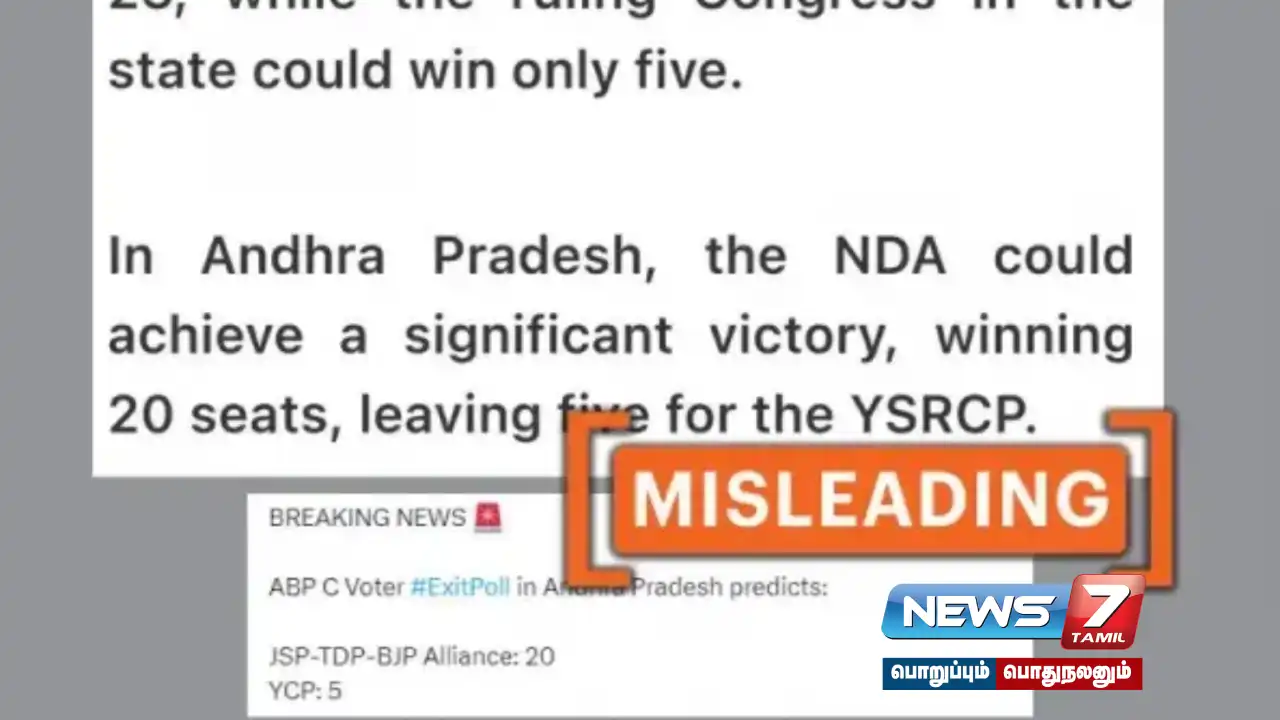தேர்தலுக்கு பிந்தைய கருத்துக் கணிப்பு முடிவுகள் வெளியான நிலையில் ஆந்திர பிரதேச மாநிலத்தில் ஆளும் ஒய்.எஸ்.ஆர் காங்கிரஸ் கட்சி தோல்வியை தழுவும் எனவும் சொற்ப இடங்களை மட்டுமே பெறும் எனவும் கருத்துக் கணிப்புகள் அடங்கிய ABC – C Voterன் கருத்துக் கணிப்பு முடிவுகள் அடங்கிய ஸ்கிரீன் ஷாட் ஒன்றை எக்ஸ் தள பயனர்கள் பலர் பகிர்ந்து வந்தனர்.