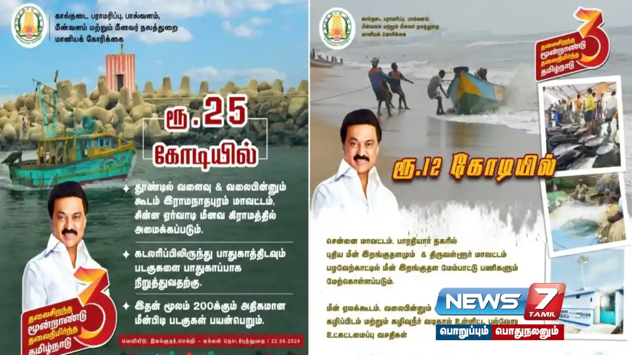 ரூ.25 கோடியில், இராமநாதபுரம் மாவட்டம், சின்ன ஏர்வாடி மீனவ கிராமத்தில் தூண்டில் வளைவு & வலைபின்னும் கூடம் அமைக்கப்படும். விழுப்புரம் மாவட்டம் சின்னமுதலியார் சாவடியில் ஒருங்கிணைந்த மீன் இறங்குதளங்கள் அமைக்கப்படும். ரூ.12 கோடியில், சென்னை மாவட்டம், பாரதியார் நகரில் புதிய மீன் இறங்குதளமும் & திருவள்ளூர் மாவட்டம் பழவேற்காட்டில் மீன் இறங்குதள மேம்பாட்டு பணிகளும் மேற்கொள்ளப்படும்.