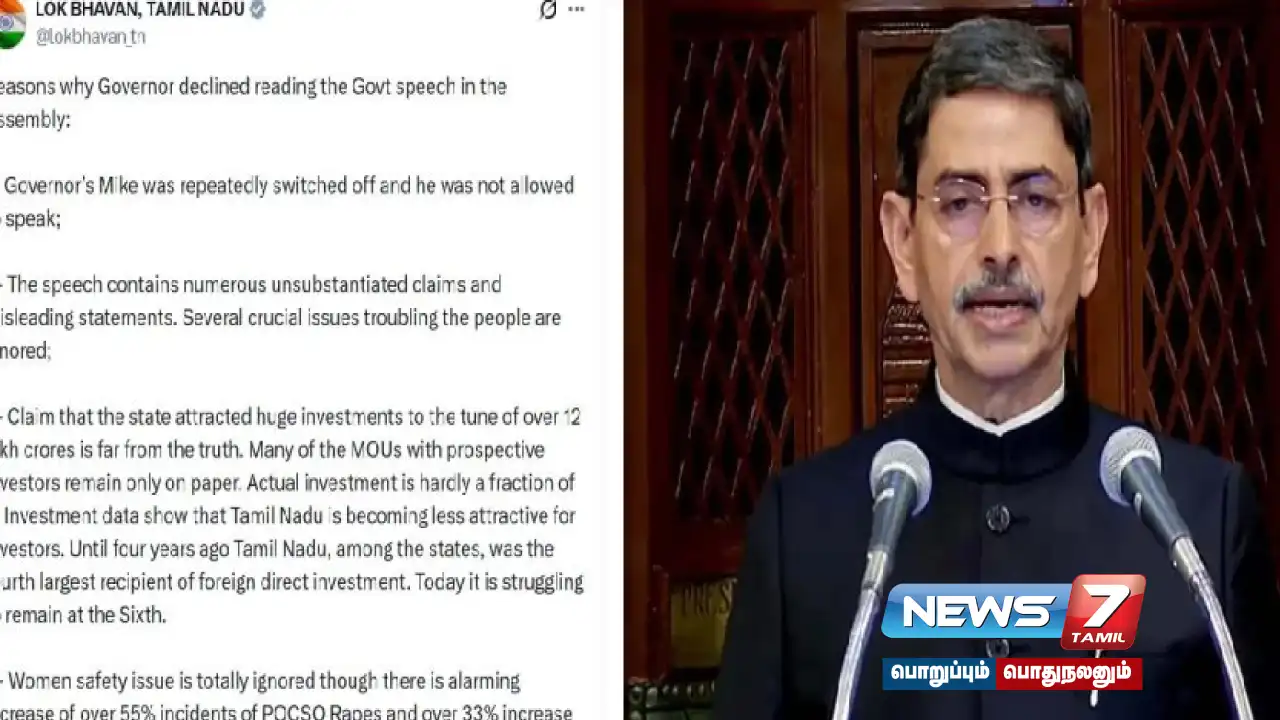சட்டசபையின் தொடக்கத்தில் தேசிய கீதம் பாடவில்லை எனக்கூறி ஆளுநர் ஆர்.என்.ரவி வெளியேறினார். இந்நிலையில் தமிழக அரசின் மீது 13 குற்றச்சாட்டுகளை அடுக்கி ஆளுநர் ஆர்.என்.ரவி விளக்க அறிக்கையை வெளியிட்டுள்ளார். அதில்,