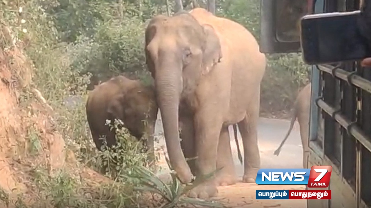 வனப்பகுதியில் நிலவி வரும் வறட்சி காரணமாக கடந்த சில நாட்களாகவே, குட்டிகளுடன் காட்டு யானைகள் சாலை ஓரங்களில் உலா வந்தும், மேய்ச்சலில் ஈடுபட்டு வருகின்றன. காட்டு யானைகள் குட்டிகளுடன் சாலையில் நின்று கொண்டிருப்பதை அறிந்த பேருந்து ஓட்டுநர் யானைகளுக்கு எவ்வித இடையூறும் ஏற்படுத்தாமல் இருக்க பேருந்தை நிறுத்தினார். பின்னர் சிறிது நேரம் கழித்து சாலையில் நின்ற காட்டு யானைகள் அமைதியாக வனப்பகுதிக்குள் சென்றன. இதனால் சிறிது நேரம் போக்குவரத்து பாதிப்பு ஏற்பட்டதோடு, பேருந்தின் உள்ளே இருந்த பயணிகள் சற்று நிம்மதி பெருமூச்சு அடைந்தனர்.