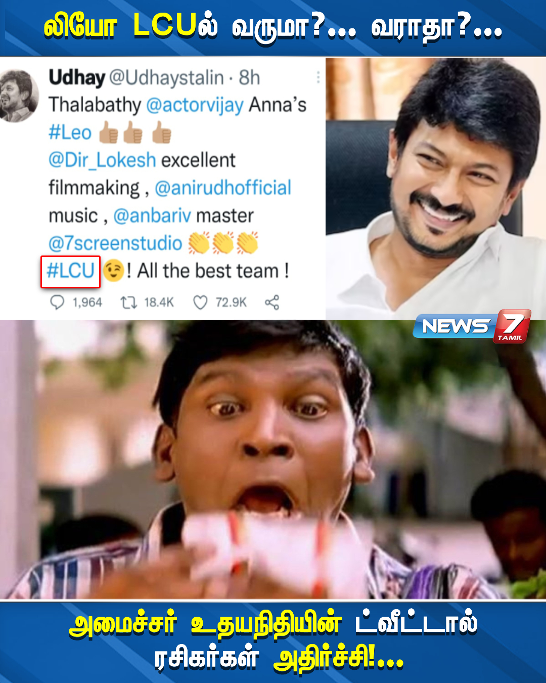 லியோ திரைப்படம் தொடங்கியதிலிருந்து இது LCUல் வருமா வராதா என்று ரசிகர்கள் தொடர்ந்து கேட்டு வந்த நிலையில் உதயநிதியின் ட்வீட் ரசிகர்களை அதிர்ச்சிக்குள்ளாக்கியுள்ளது.