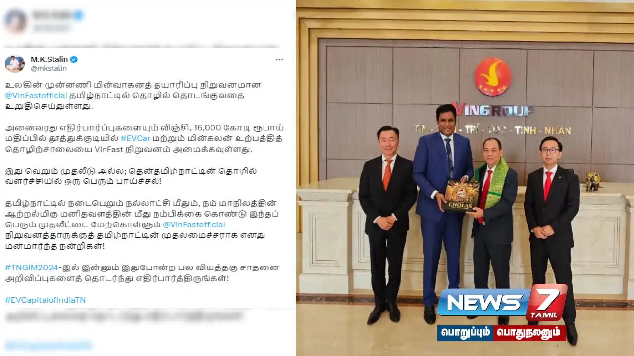 “உலகின் முன்னணி மின்வாகனத் தயாரிப்பு நிறுவனமான வின்ஃபாஸ்ட், தமிழ்நாட்டில் தொழில் தொடங்குவதை உறுதிசெய்துள்ளது. அனைவரது எதிர்பார்ப்புகளையும் விஞ்சி, 16,000 கோடி ரூபாய் மதிப்பில் தூத்துக்குடியில் மின்சார கார் மற்றும் மின்கலன் உற்பத்தித் தொழிற்சாலையை வின்ஃபாஸ்ட் நிறுவனம் அமைக்கவுள்ளது. இது வெறும் முதலீடு அல்ல.