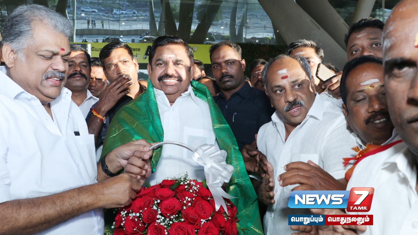 அதிமுக இடைக்கால பொதுச்செயலாளர் எடப்பாடி பழனிச்சாமி கோவையில் இருந்து விமானம் மூலம் இன்று காலை சென்னை வந்தார். விமான நிலையத்தில் அவருக்கு அதிமுக தொண்டர்கள் உற்சாக வரவேற்பு அளித்தனர். அப்போது, டெல்லி செல்வதறாக அங்கு இருந்த தாமாக தலைவர் ஜி.கே.வாசனும், எடப்பாடி பழனிசாமியை வரவேற்றார்.