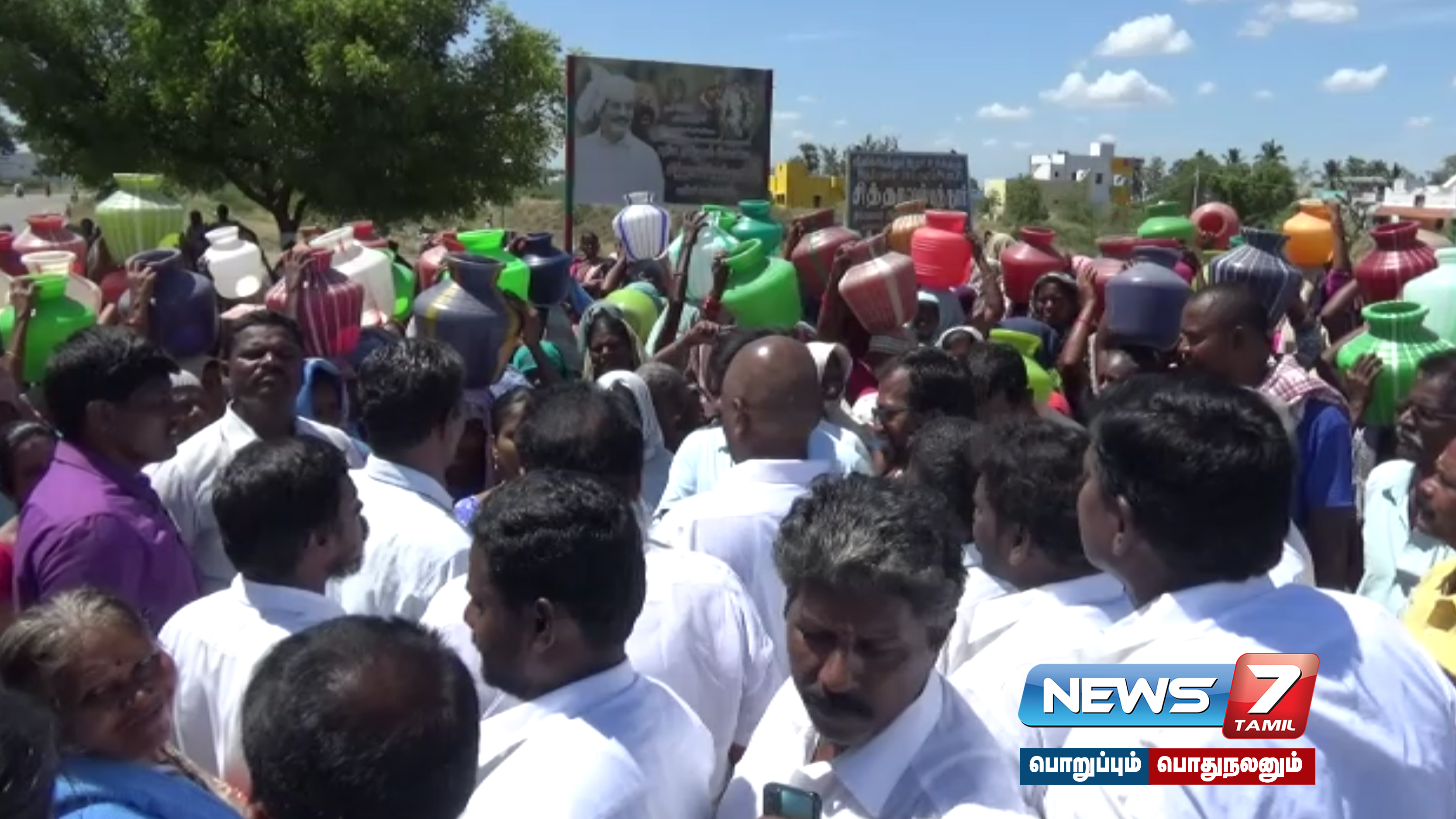 பெண்கள் தலையில் காலி குடங்களுடன் ஸ்ரீவில்லிபுத்தூர் – சிவகாசி சாலையில்