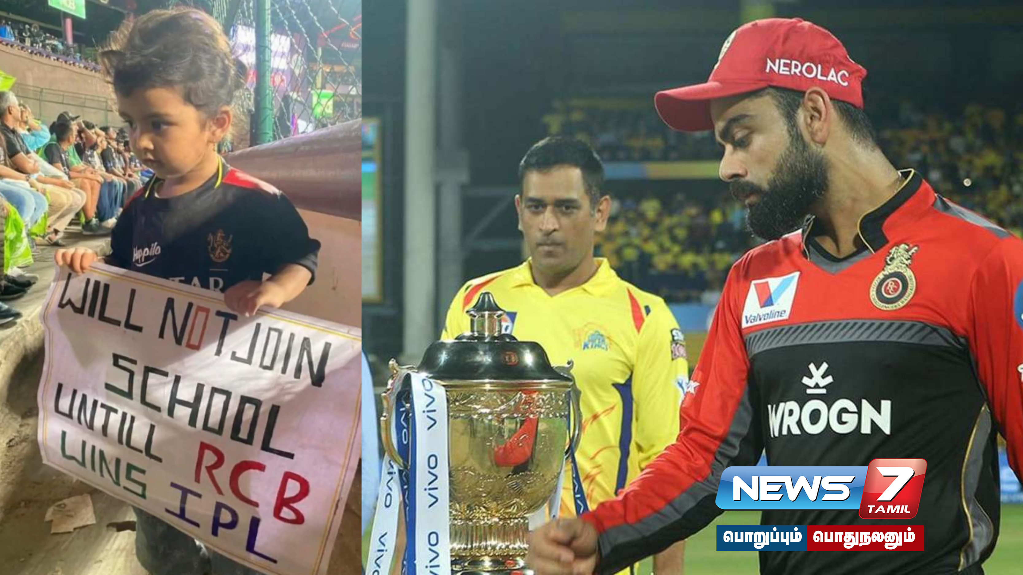 ஐபிஎல் போட்டியில் கோப்பையை RCB வெல்லும் வரை பள்ளியில் சேரமாட்டேன் என ஒரு குழந்தை பலகையை ஏந்தி நிற்கும் வீடியோ இணையத்தில் வைரலாகி வருகிறது.