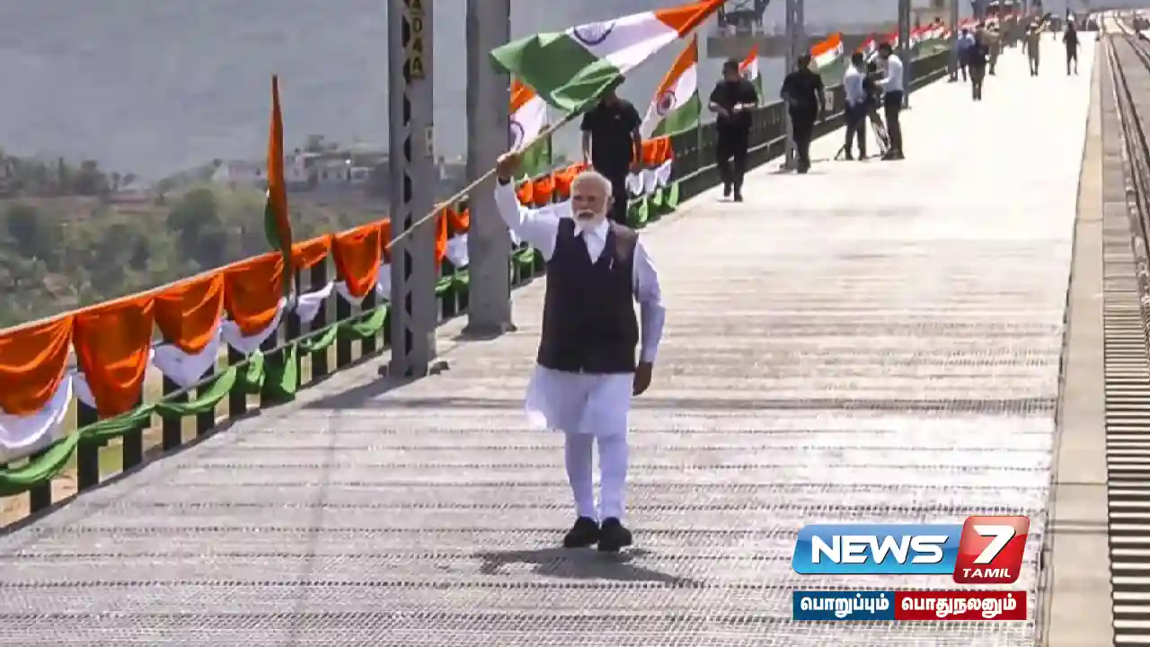 இந்த நிலையில் இன்று காலை 11 மணிக்கு ரயில்வே பாலத்தை பிரதமர் நரேந்திர மோடி திறந்து வைத்து பார்வையிட்டார். இதனைத்தொடர்ந்து கம்பி வழி ரயில் பாலமான அஞ்சி பாலத்தையும் திறந்து வைத்தார்.