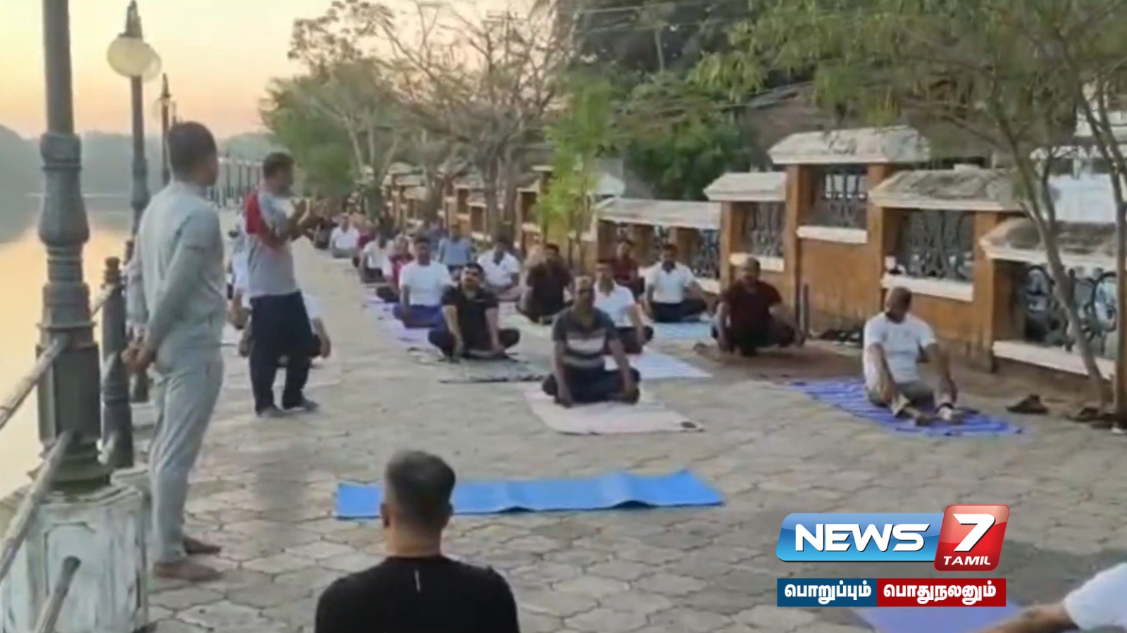 போலீசாருக்கு மஞ்சக்கால் படகு குழாம் அருகே மன அழுத்தத்தை குறைக்கும் யோகா
